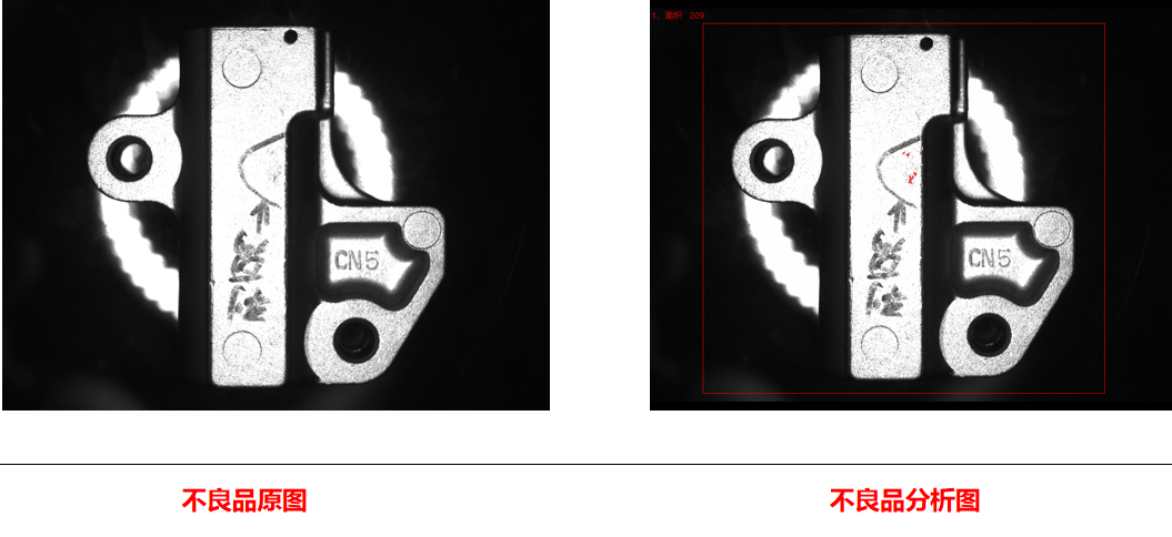 相機5、6側(cè)面正光檢測不良品分析圖:NG    結(jié)論:AI可檢                       檢測特征:毛刺